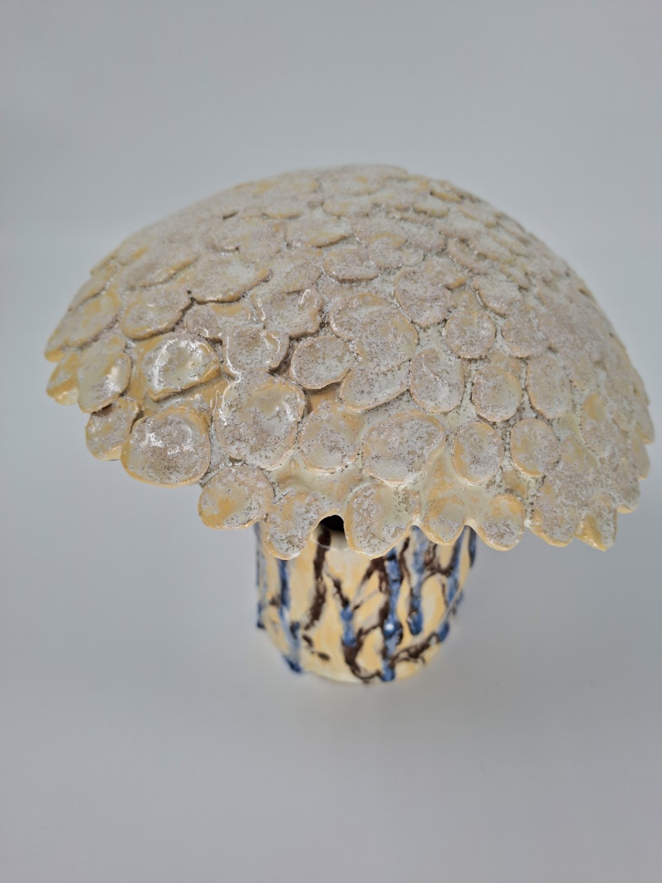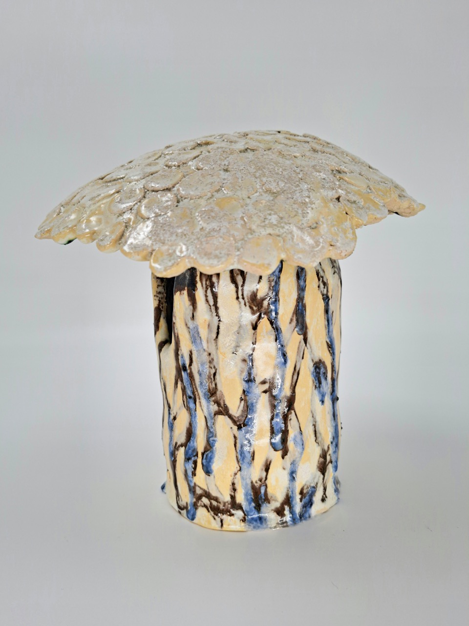 This is a light object is made from white chamotte, featuring an experimental surface with metal oxides and recycled glas. They were produced only once in this form. The object can be placed on a horizontal surface.